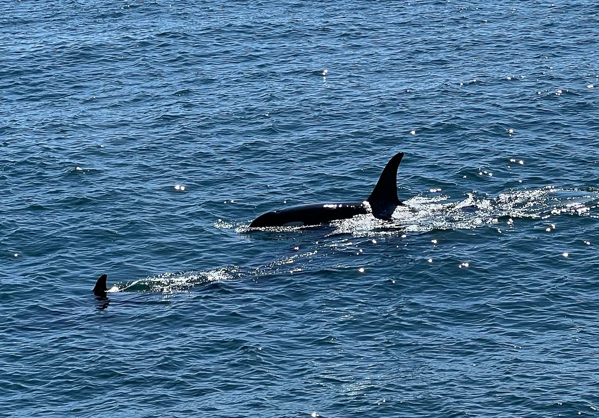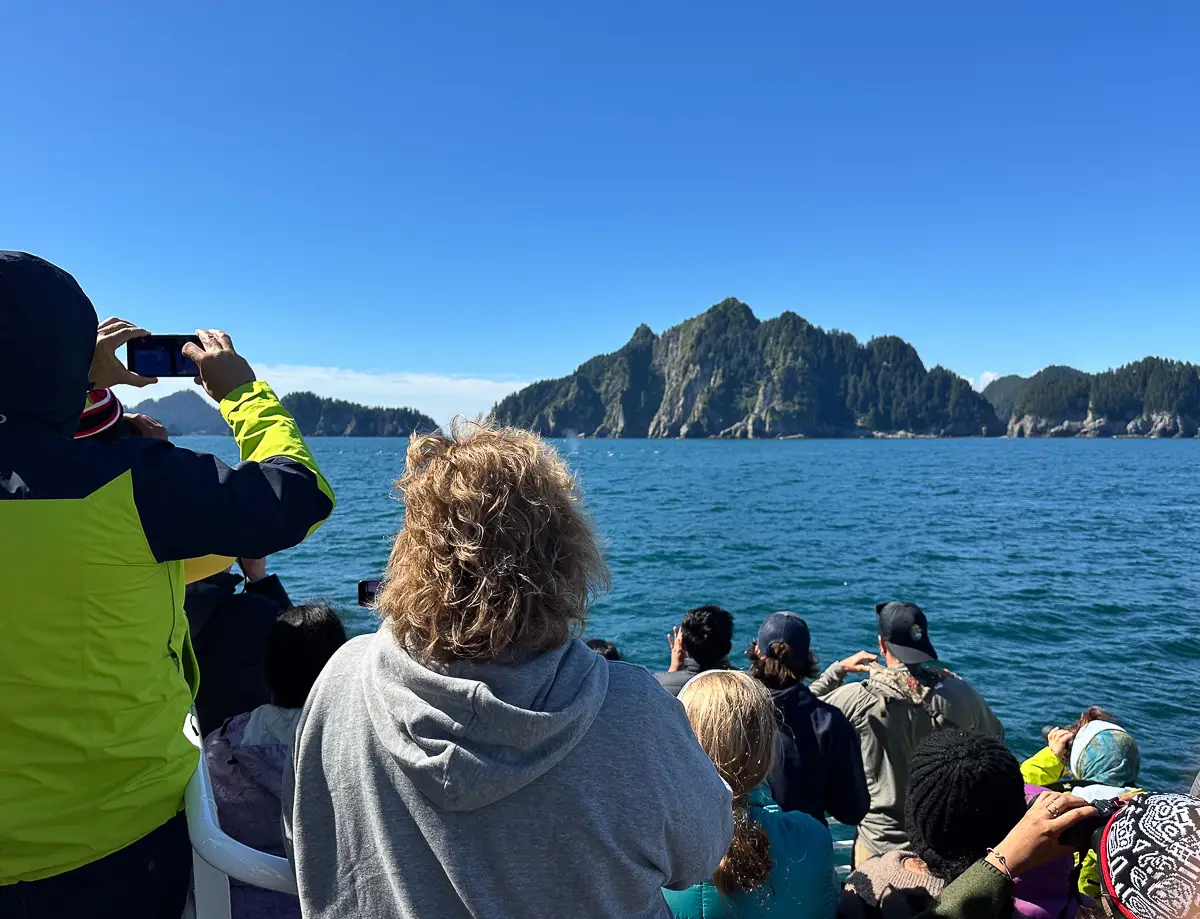 It turned out to be a beautiful day out on beautiful Resurrection Bay, but the boat was full. When we came across the whales playing I was in the wrong place for photos and only saw glimpses. However one of our group was kind enough to share their photo.