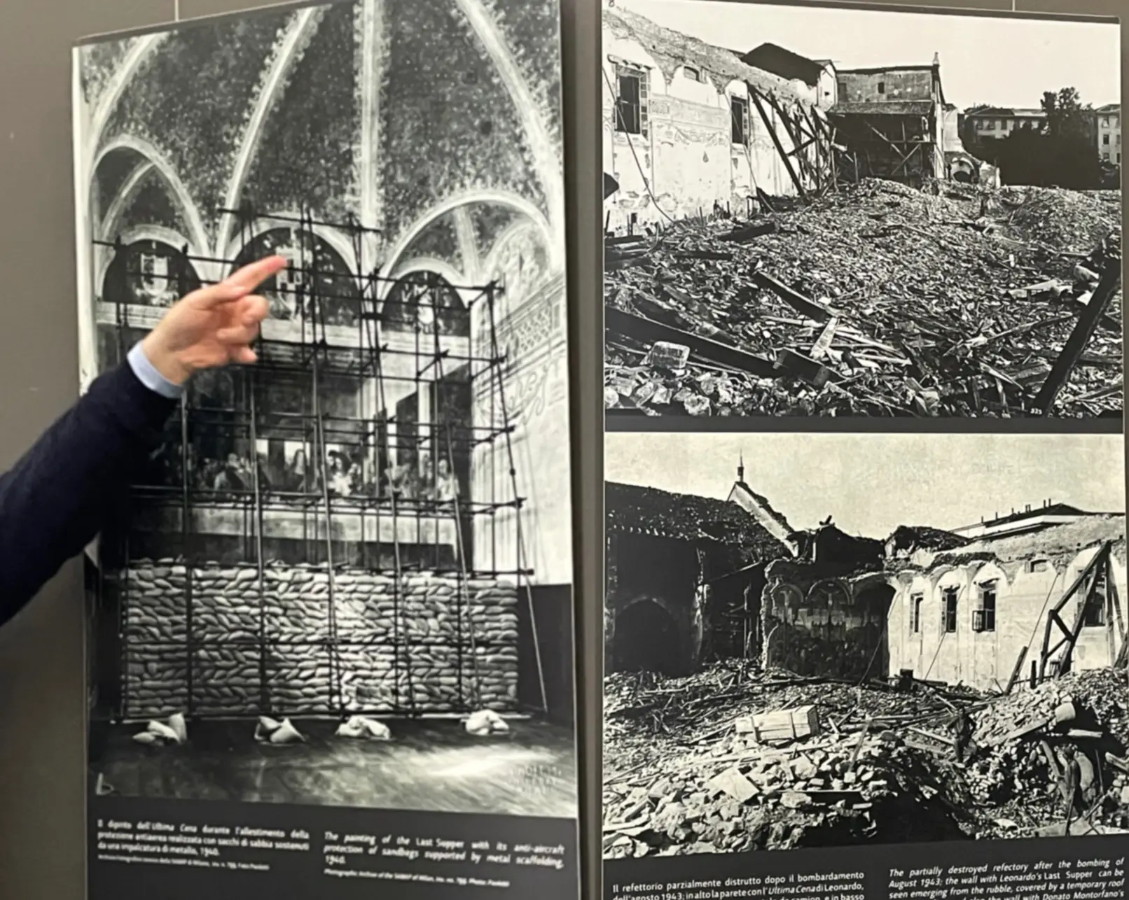This masterpiece is still with us today even though the innovative dry painting technique Da Vinci used is problematic and the area was bombed during the war. As a precaution locals had erected iron scaffolding and filled them with sandbags.