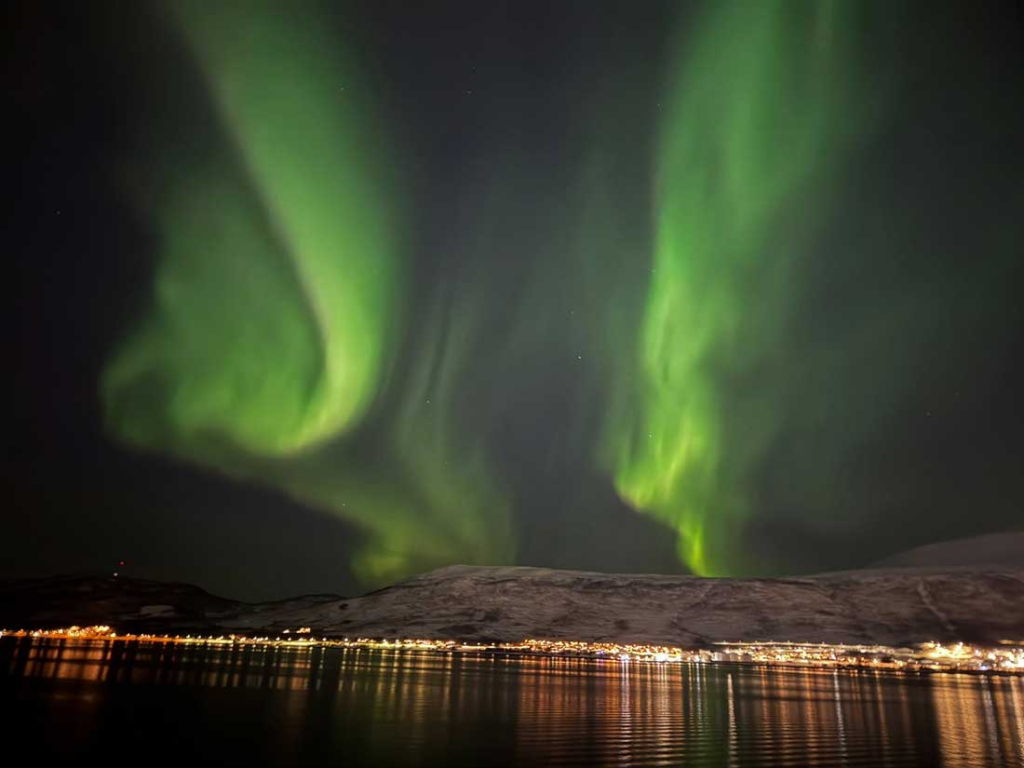 As we were making our last stop before returning to the MS Nordkapp, Jeanine sent out a message that the lights may appear. Sure enough, around 6:30pm the short light show began. Since we had just returned from a long outing I had to leave for a bit to take care of some things. Of course, by the time I returned, the show was over for now. We will be in the arctic circle for a few more days, so I am hopeful that it will appear again. Fingers crossed. The first picture is a photo I shot early on with my iPhone and the second is one of Jeanine’s photo with her camera equipment.