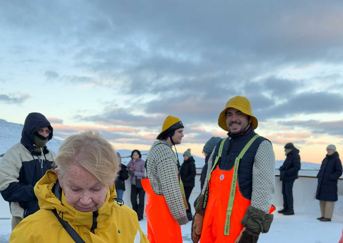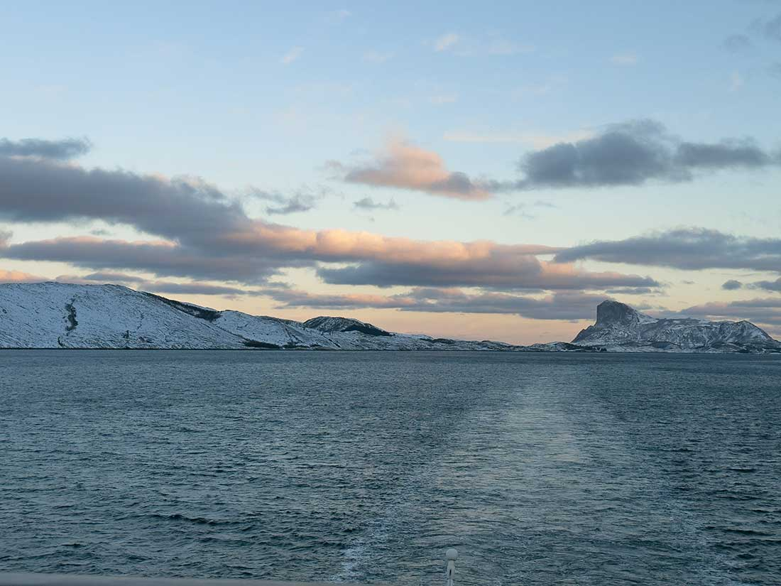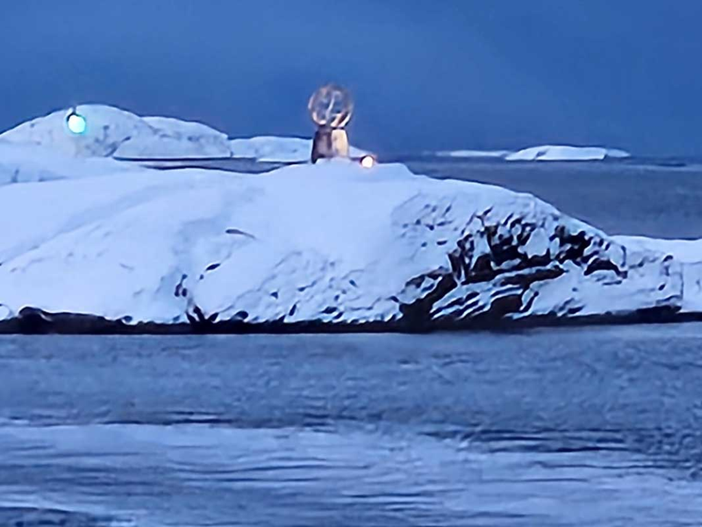 Today was a full day at sea and a good chance for some much needed rest. The main event I attended at 8:30 this morning was crossing out of the Arctic Circle on our southbound voyage. As you may recall, Donna and I missed the north bound crossing since we were still in quarantine. Fortunately I did get a photo of the marker from that crossing. Good thing. Because as you can see in this snapshot, “shortie” was not near enough to the railing for a photo op this morning.