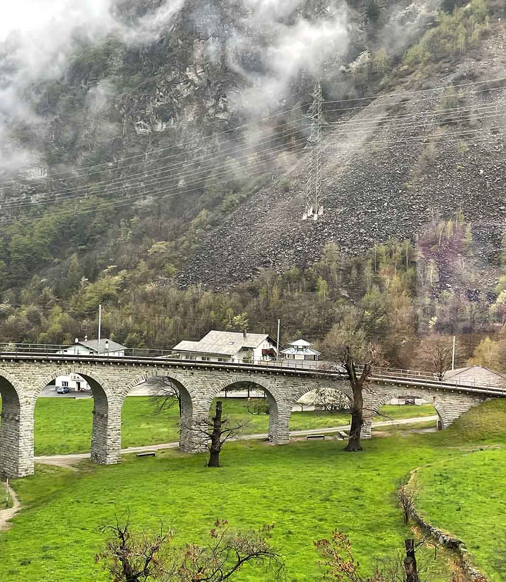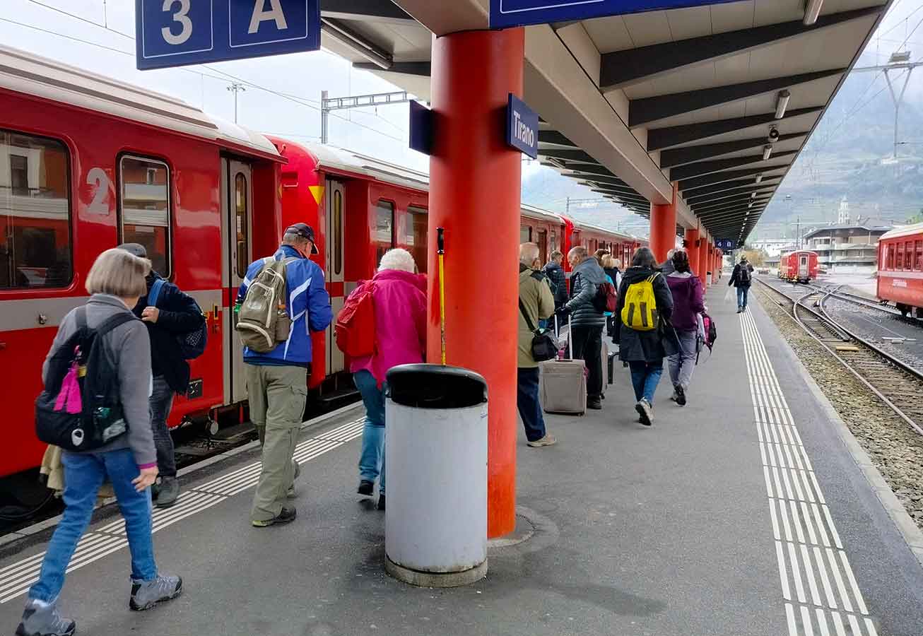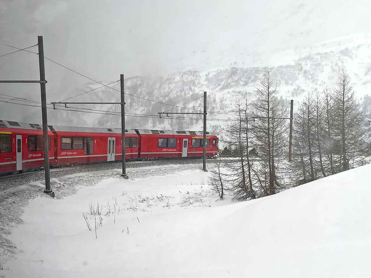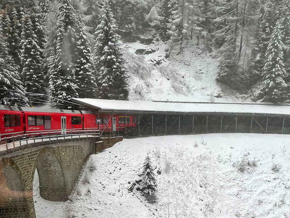 The Bernini Express begins in Tirano, Italy, then crosses into Switzerland through the Alps to Davos. It is not an “express” in the sense of being a high-speed train: rather it has panoramic coaches with enlarged windows and caters to tourist and skiers.